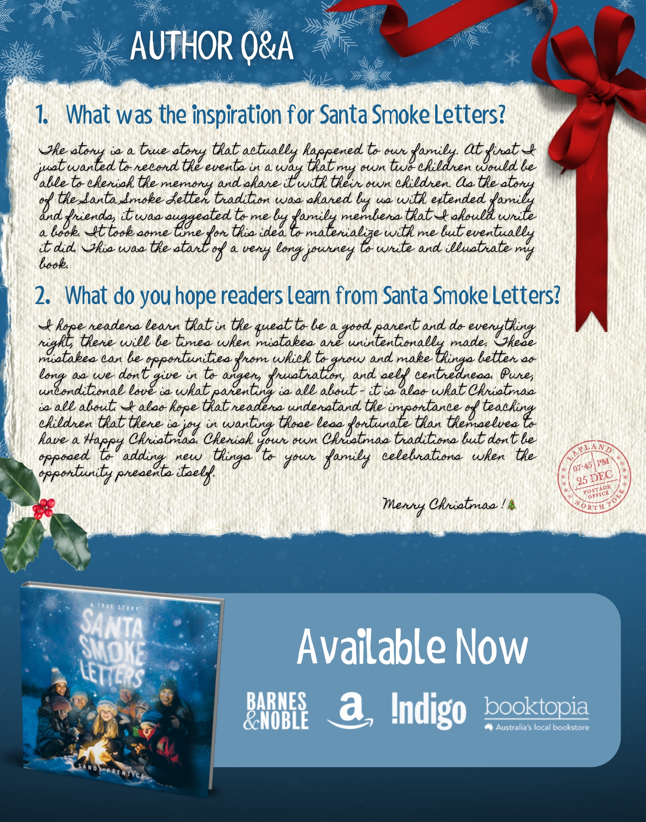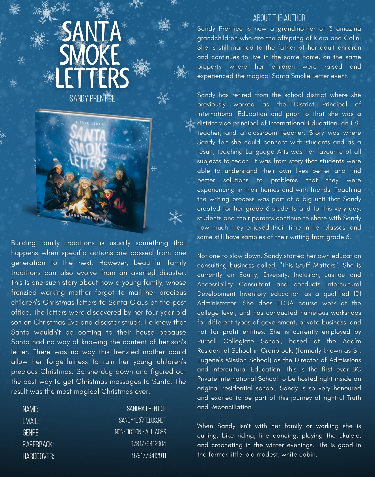 Sandy Prentice is now a grandmother of 3 amazing grandchildren who are the offspring of Kiera and Colin. She is still married to the father of her adult children and continues to live in the same home on the same property where her children were raised and experienced the magical Santa Smoke Letter event.